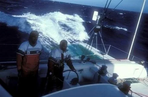 1993/94 – Enza New Zealand - The Jules Verne Enza Force 10 Cape Horn In 1992 RKJ and Peter Blake teamed up to attempt to sail around the world in less than 80 days. The catamaran Tag was purchased for the attempt, refitted and lengthened and the team set out against Bruno Peyron in “Commodore Explorer”. The Frenchman had a half day lead halfway between Africa and Australia when “Enza” struck an object in the sea which tore a hole in the starboard float. The boat was forced to return to South Africa and Bruno Peyron managed to finish his voyage in just under the magic 80 days, the first person to do so. Re-fitted and lengthened to 92 feet she started again from Ushant in 1994 against Olivier de Kersuason in “”Lyonnaise des Eaux-Dumez” With Bob Rice providing meteorological support, a very fast run down the Atlantic was made, the equator being reached in 7 days, 4 hours, 24 minutes, and Australia was to the north in 30 days. 70 days looked possible, but an unusual weather pattern meant the second leg of the Southern Ocean to Cape Horn lost time, and when crossing the equator in the Atlantic the Doldrums jumped the boat so it had to sail through them twice. Nevertheless the boat returned to Brest in a new world record time of 74 days, 22 hours, 18 minutes and 22 seconds, an average speed of 14.8 knots. Book “Beyond Jules Verne” 1995 Hodders.
